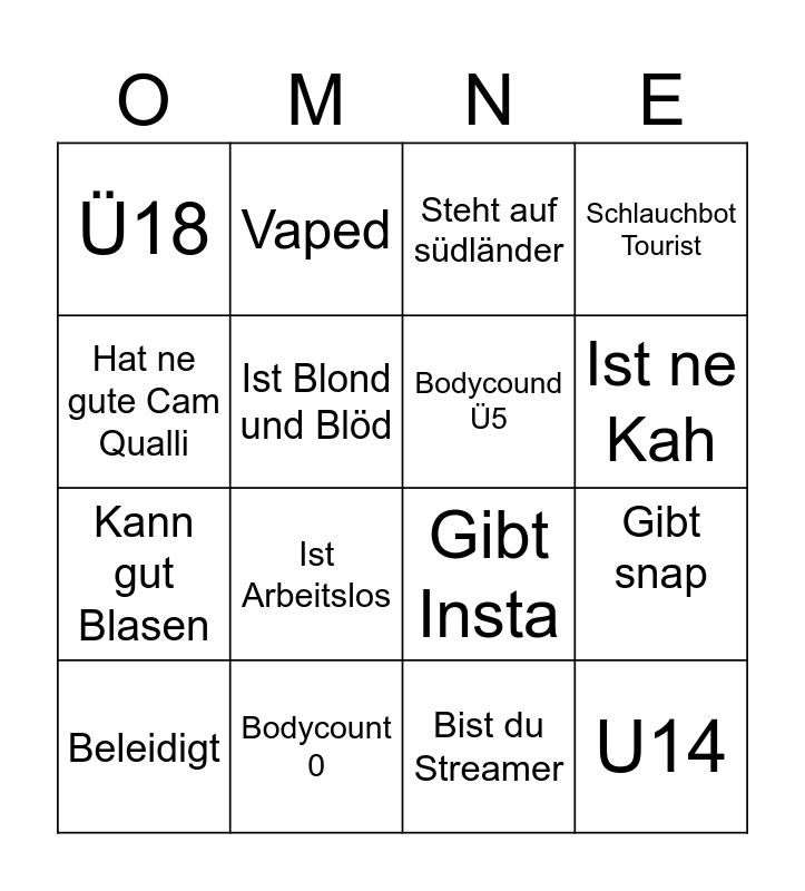 This bingo card has 16 words: Bodycount 0, Gibt snap, Steht auf südländer, Ü18, Kann gut Blasen, Vaped, Gibt Insta, Bist du Streamer, Hat ne gute Cam Qualli, Ist Blond und Blöd, Beleidigt, Schlauchbot Tourist, Ist Arbeitslos, Ist ne Kah, Bodycound Ü5 and U14.