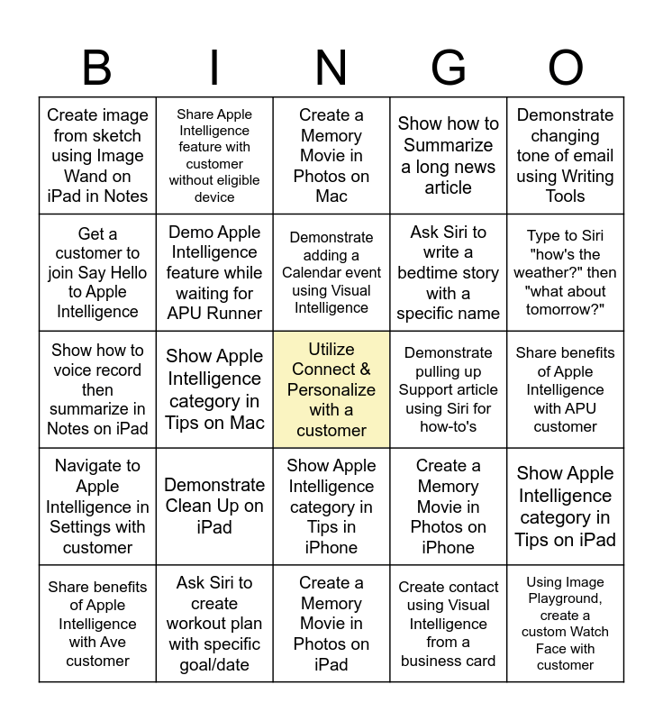 This bingo card has a free space and 36 words: Demonstrate Clean Up on Mac, Share feature with customer with eligible device identified through C&P, Identify Vancouver Art Gallery with Visual Intelligence, Demo Apple Intelligence feature while waiting for APU Runner, Create a Memory Movie in Photos on iPhone, Navigate to Apple Intelligence in Settings with customer, Demonstrate adding a Calendar event using Visual Intelligence, Use Visual Intelligence for recipe from picture of food, Demonstrate changing tone of email using Writing Tools, Demonstrate how to blur out faces using Clean Up, Show Apple Intelligence category in Tips on Mac, Show how to Summarize a long news article, Activate Visual Intelligence on a customer's 15 Pro/Pro Max, Demonstrate pulling up Support article using Siri for how-to's, Type to Siri "how's the weather?" then "what about tomorrow?", Create image from sketch using Image Wand on iPad in Notes, Demonstrate responding to an email with Writing Tools on Mac, Demonstrate Clean Up on iPad, Using Image Playground, create a custom Watch Face with customer, Create a Memory Movie in Photos on Mac, Share benefits of Apple Intelligence with APU customer, Show Apple Intelligence category in Tips on iPad, Ask Siri to create workout plan with specific goal/date, Share benefits of Apple Intelligence with Ave customer, Create a Memory Movie in Photos on iPad, Share Apple Intelligence feature with customer without eligible device, Show how to voice record then summarize in Notes on iPad, Demonstrate creating Genmoji with description of yourself, Ask Siri to write a bedtime story with a specific name, Get a customer to join Say Hello to Apple Intelligence, Sign a customer up for Spotlight: Apple Intelligence, Show how to translate text in Camera on iPhone, Create contact using Visual Intelligence from a business card, Show Apple Intelligence category in Tips in iPhone, Demonstrate Apple Intelligence on 16e and Talk about the Privacy benefits of Apple Intelligence.