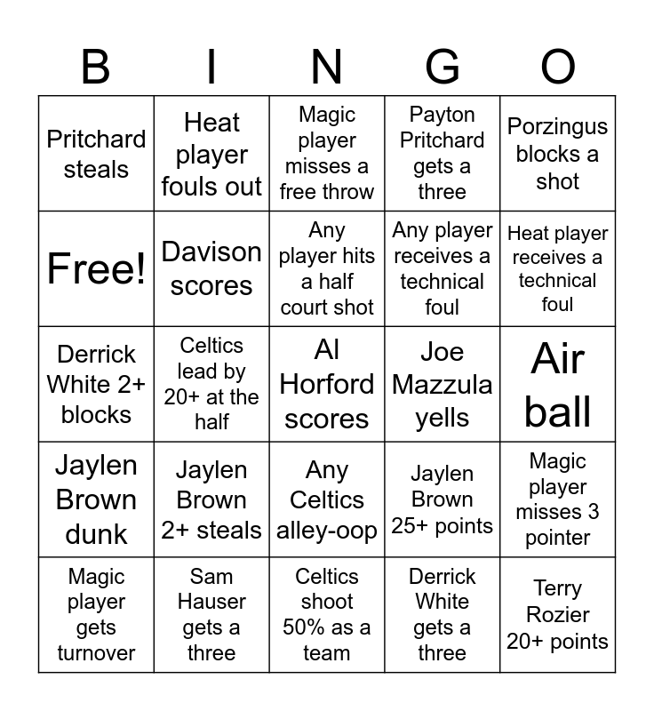 This bingo card has 59 words: Queta scores, Sam Hauser gets a three, Magic under 50 pts at half, Jaylen Brown dunk, Derrick White gets a three, Celtics final score 125+, Davison scores, Peterson scores, Any player receives a technical foul, Celtics win!, Payton Pritchard gets a three, Any player hits a buzzer beater, Free!, Celtics grabs a rebound, Brown scores a free throw, Pritchard steals, Al Horford scores, Porzingus blocks a shot, Luke Kornet scores, Any player hits a half court shot, Joe Mazzula yells, Magic player misses a free throw, Magic player gets turnover, Magic player misses 3 pointer, Brown looks angry, Celtics player reaches 10+ assists, Celtics win by 20+, Any player records 40+ minutes, Heat player receives a technical foul, Any player is called for a travel, Celtics win the tipoff, Dunkin donuts commercial plays, Any buzzer beater, Combined final score of 235+, Heat player fouls out, Any technical foul is called, Heat player misses two free throws in a row, Celtics lead by 20+ at the half, Payton Pritchard 20+ points, Derrick White 2+ blocks, A drink is spilled on the court, Jaylen Brown 2+ steals, Air ball, Jayson Tatum 8+ rebounds, Al Horford 2+ threes, Derrick White 5+ assists, Jrue holiday 15+ points, Kristaps Porzingis dunk, Any Celtics alley-oop, Celtics shoot 50% as a team, DraftKings advertisement is played, Jayson Tatum double double, Kristaps Porzingis double double, Any coach receives a technical foul, Any player records 5+ stocks, Jaylen Brown 25+ points, Duncan Robinson 3+ threes, Terry Rozier 20+ points and Tyler Herro 3+ threes.