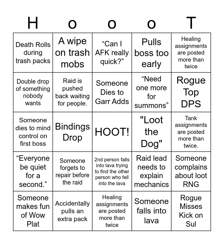 This bingo card has a free space and 24 words: Someone forgets to repair before the raid, Accidentally pulls an extra pack, Someone Dies to Garr Adds, Someone makes fun of Wow Plat, Healing assignments are posted more than twice, Death Rolls during trash packs, Double drop of something nobody wants, A wipe on trash mobs, "Loot the Dog", 2nd person falls into lava trying to find the other person who fell into the lava, “Need one more for summons”, Someone dies to mind control on first boss, Raid lead needs to explain mechanics, Someone complains about loot RNG, Raid is pushed back waiting for people., Someone falls into lava, Tank assignments are posted more than twice., “Can I AFK really quick?”, Rogue Top DPS, Bindings Drop, Rogue Misses Kick on Sul, “Everyone be quiet for a second.”, Pulls boss too early and Healing assignments are posted more than twice.