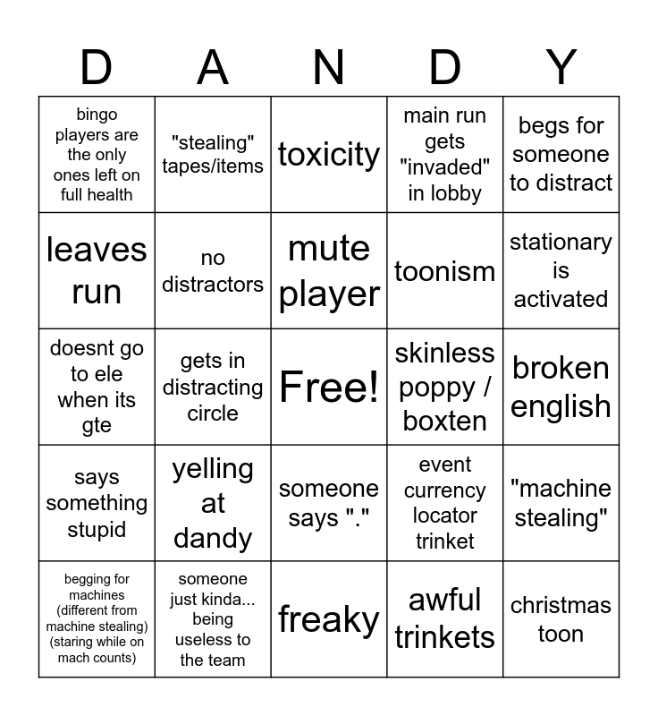 This bingo card has a free space and 32 words: awful trinkets, someone dies immediately (floor 3>), gets in distracting circle, does something stupid, says something stupid, no distractors, begs for someone to distract, "machine stealing", "stealing" tapes/items, heal stealing, mute player, toxicity, star time, fancy purse, skinless poppy / boxten, does not understand stealth, begging for machines (different from machine stealing) (staring while on mach counts), doesnt go to ele when its gte, someone says ".", yelling at dandy, event currency locator trinket, run type changes (nobody agreed on it), broken english, someone just kinda... being useless to the team, christmas toon, main run gets "invaded" in lobby, toonism, leaves run, bingo players are the only ones left on full health, freaky, lobotomized and stationary is activated.