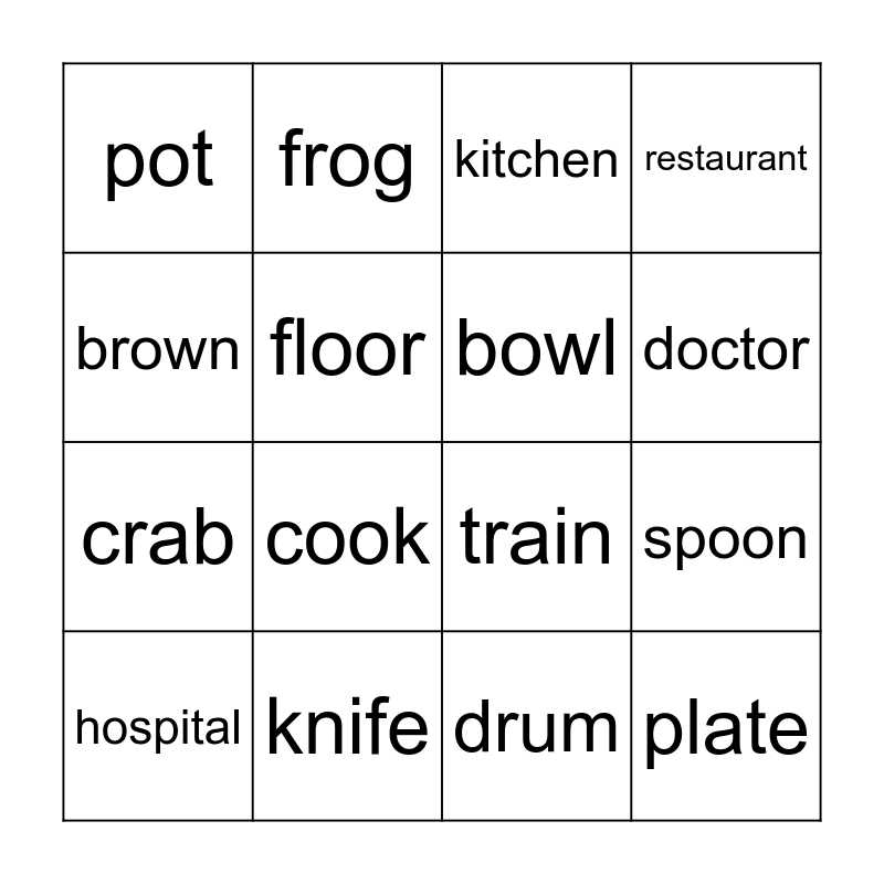 This bingo card has 16 words: knife, spoon, kitchen, pot, crab, frog, train, drum, brown, floor, hospital, restaurant, cook, doctor, bowl and plate.