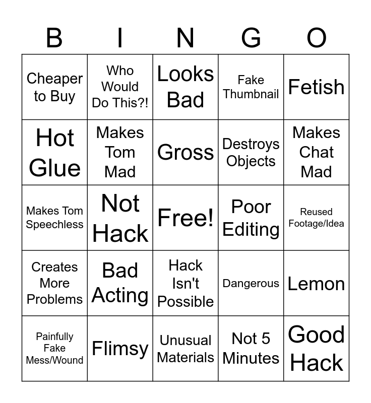 This bingo card has a free space and 24 words: Bad Acting, Flimsy, Gross, Painfully Fake Mess/Wound, Fetish, Cheaper to Buy, Hot Glue, Who Would Do This?!, Poor Editing, Hack Isn't Possible, Destroys Objects, Makes Tom Speechless, Dangerous, Lemon, Makes Tom Mad, Not 5 Minutes, Reused Footage/Idea, Looks Bad, Makes Chat Mad, Not Hack, Good Hack, Creates More Problems, Fake Thumbnail and Unusual Materials.