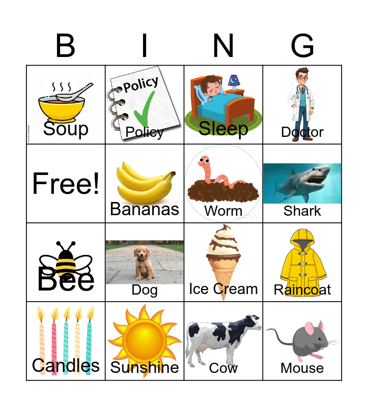 This bingo card has 15 images and 16 words: Sunshine, Raincoat, Sleep, Soup, Bee, Policy, Ice Cream, Cow, Free!, Bananas, Candles, Doctor, Dog, Shark, Worm and Mouse.