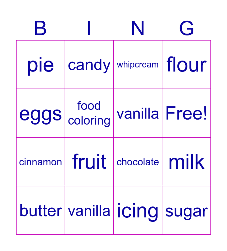 This bingo card has 18 words: fruit, sugar, whipcream, pie, chocolate, flour, butter, candy, Free!, cinnamon, icing, eggs, milk, food coloring, vanilla, sprinkles, vanilla and cheese.