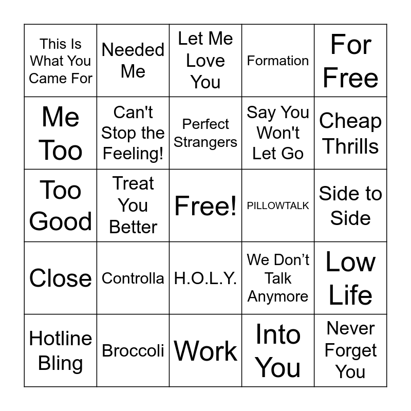 This bingo card has a free space and 31 words: Work, One Dance, Treat You Better, Heathens, This Is What You Came For, Let Me Love You, Can't Stop the Feeling!, We Don’t Talk Anymore, PILLOWTALK, Into You, Side to Side, Never Forget You, Never Be Like You, Black Beatles, Cheap Thrills, Sucker for Pain, Low Life, Controlla, Close, H.O.L.Y., For Free, Middle, Hotline Bling, Needed Me, Say You Won't Let Go, Me Too, Formation, Too Good, Broccoli, Perfect Strangers and Panda.