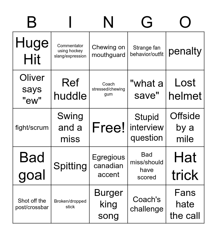 This bingo card has a free space and 24 words: Spitting, Broken/dropped stick, Coach stressed/chewing gum, Shot off the post/crossbar, penalty, Huge Hit, Oliver says "ew", Commentator using hockey slang/expression, Stupid interview question, Egregious canadian accent, "what a save", fight/scrum, Bad miss/should have scored, Hat trick, Ref huddle, Coach's challenge, Offside by a mile, Chewing on mouthguard, Lost helmet, Swing and a miss, Fans hate the call, Bad goal, Strange fan behavior/outfit and Burger king song.