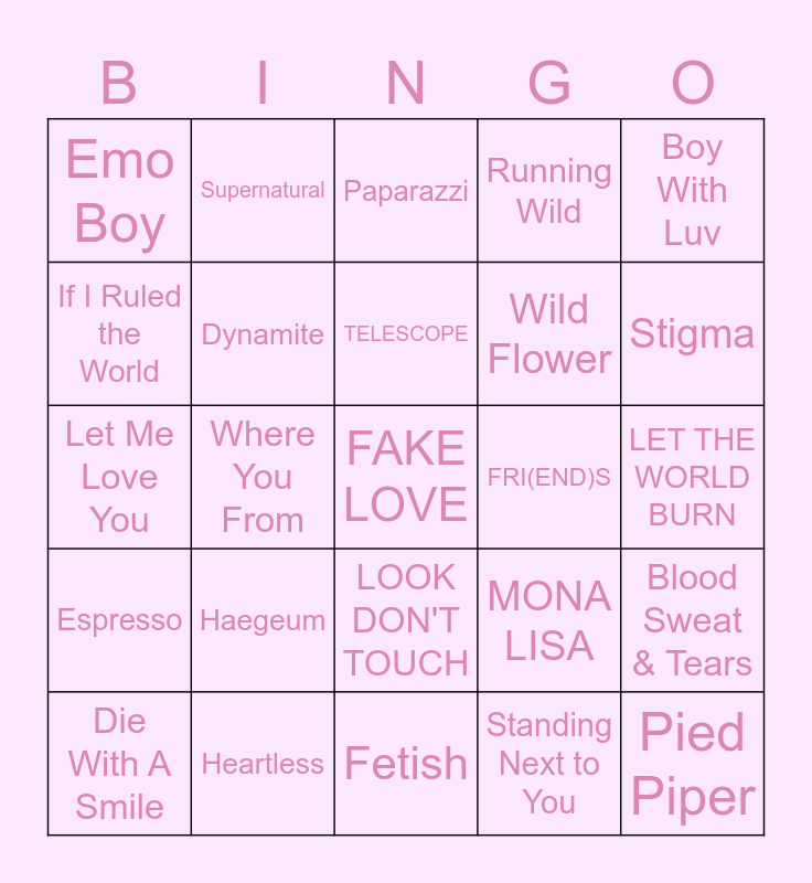 This bingo card has a free space and 24 words: Haegeum, Heartless, TELESCOPE, Die With A Smile, Boy With Luv, Emo Boy, If I Ruled the World, Supernatural, FRI(END)S, LOOK DON'T TOUCH, Wild Flower, Let Me Love You, MONA LISA, Blood Sweat & Tears, Dynamite, Standing Next to You, LET THE WORLD BURN, Paparazzi, Stigma, Where You From, Pied Piper, Espresso, Running Wild and Fetish.