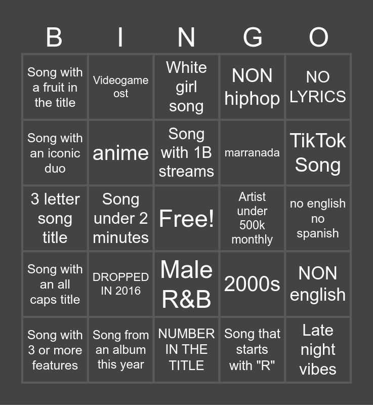 This bingo card has a free space and 24 words: DROPPED IN 2016, Song from an album this year, Song with 1B streams, Song with 3 or more features, NO LYRICS, Song with a fruit in the title, Song with an iconic duo, Videogame ost, Artist under 500k monthly, Male R&B, marranada, 3 letter song title, 2000s, NON english, anime, Song that starts with "R", no english no spanish, White girl song, TikTok Song, Song under 2 minutes, Late night vibes, Song with an all caps title, NON hiphop and NUMBER IN THE TITLE.