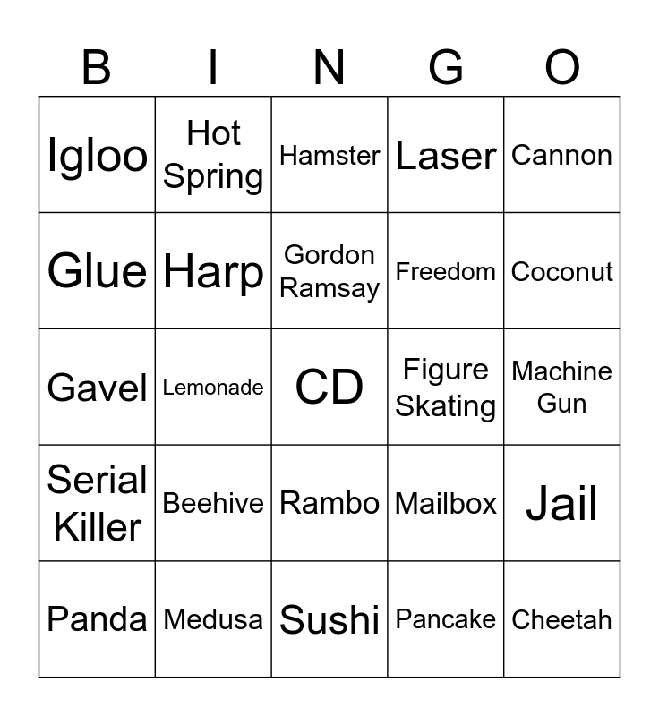 This bingo card has a free space and 24 words: Beehive, Medusa, Gordon Ramsay, Panda, Cannon, Igloo, Glue, Hot Spring, Figure Skating, Rambo, Freedom, Gavel, Mailbox, Jail, Harp, Pancake, Machine Gun, Hamster, Coconut, Lemonade, Cheetah, Serial Killer, Laser and Sushi.