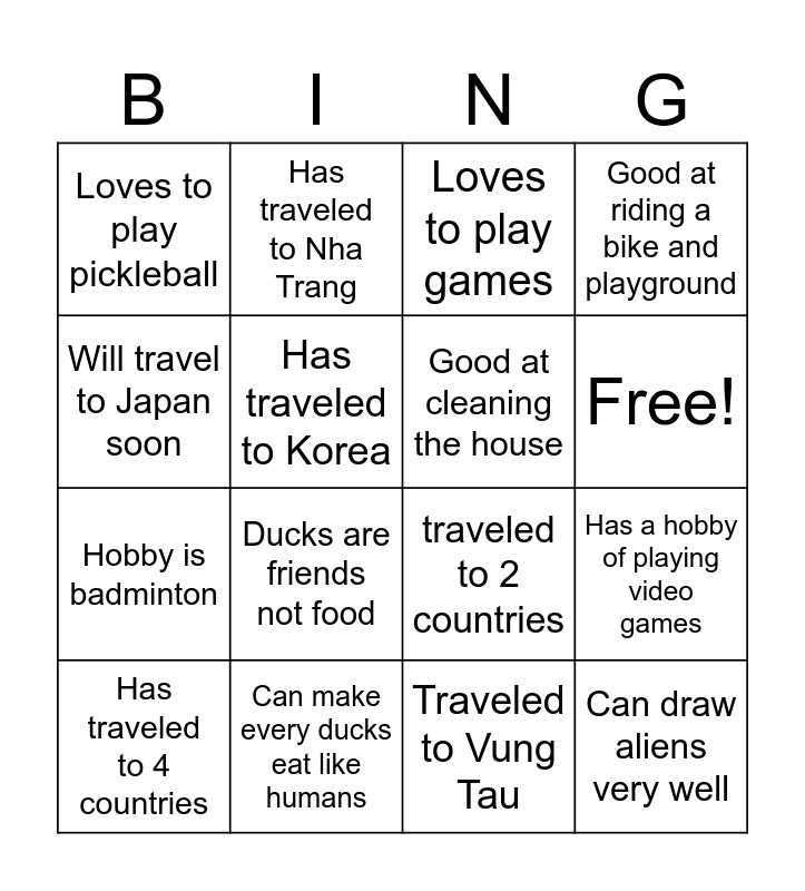 This bingo card has 17 words: Traveled to Vung Tau, Has traveled to 4 countries, Loves to play games, Loves to play pickleball, Ducks are friends not food, Good at riding a bike and playground, Has a hobby of playing video games, Good at cleaning the house, Free!, Has traveled to Korea, Can make every ducks eat like humans, traveled to 2 countries, Will travel to Japan soon, Has traveled to Nha Trang, Hobby is badminton, Has eaten Kobe beef before and Can draw aliens very well.