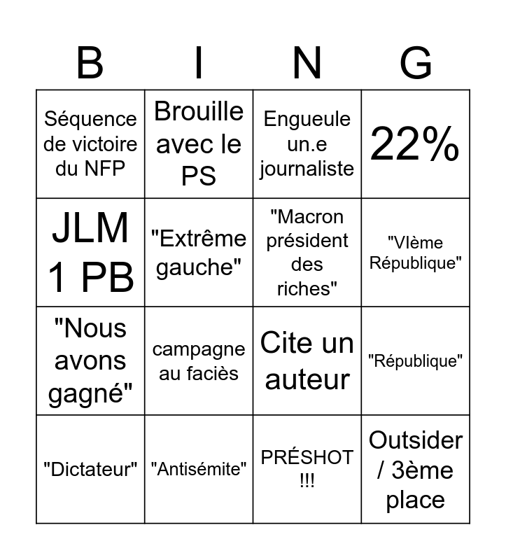 This bingo card has 16 words: "Antisémite", "République", Engueule un.e journaliste, Séquence de victoire du NFP, "Nous avons gagné", Brouille avec le PS, Cite un auteur, PRÉSHOT !!!, JLM 1 PB, "Extrême gauche", "Dictateur", 22%, campagne au faciès, "VIème République", "Macron président des riches" and Outsider / 3ème place.