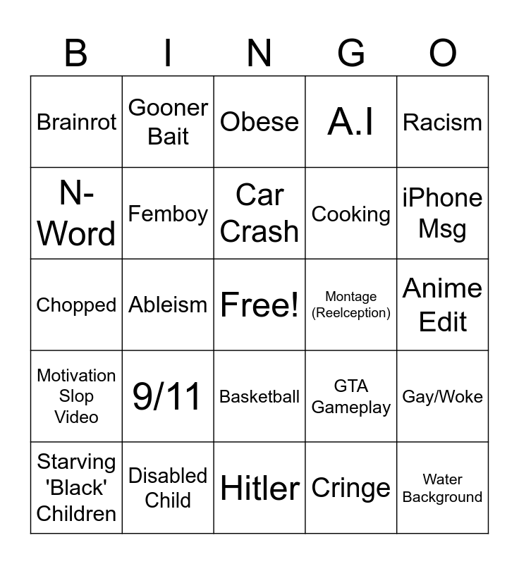 This bingo card has a free space and 24 words: 9/11, Disabled Child, Car Crash, Starving 'Black' Children, Racism, Brainrot, N-Word, Gooner Bait, Montage (Reelception), Basketball, Cooking, Chopped, GTA Gameplay, Gay/Woke, Femboy, Cringe, Anime Edit, Obese, iPhone Msg, Ableism, Water Background, Motivation Slop Video, A.I and Hitler.