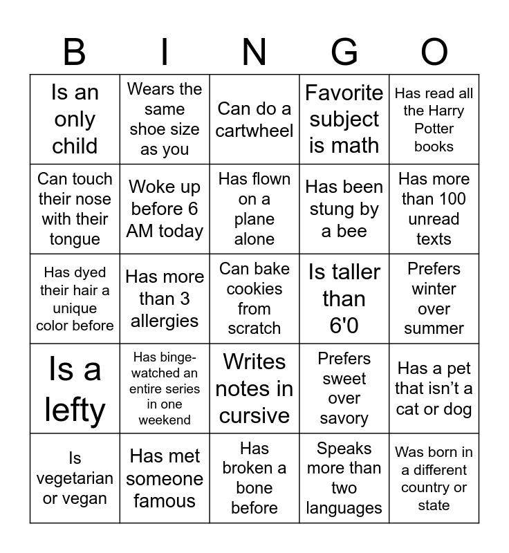 This bingo card has 25 words: Is a lefty, Has met someone famous, Can bake cookies from scratch, Speaks more than two languages, Has read all the Harry Potter books, Is an only child, Wears the same shoe size as you, Can do a cartwheel, Is taller than 6'0, Has a pet that isn’t a cat or dog, Can touch their nose with their tongue, Woke up before 6 AM today, Has broken a bone before, Prefers sweet over savory, Has more than 100 unread texts, Is vegetarian or vegan, Has more than 3 allergies, Has flown on a plane alone, Has been stung by a bee, Prefers winter over summer, Has dyed their hair a unique color before, Has binge-watched an entire series in one weekend, Writes notes in cursive, Favorite subject is math and Was born in a different country or state.