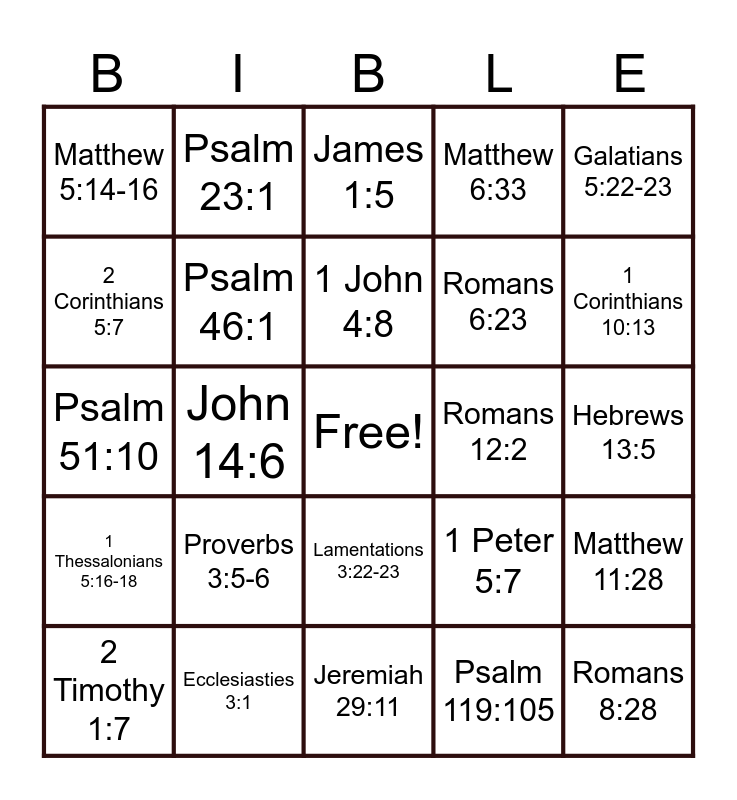 This bingo card has a free space and 49 words: John 3:16, Romans 8:28, Philippians 4:13, Jeremiah 29:11, Proverbs 3:5-6, Isaiah 41:10, Psalm 23:1, Romans 10:9, 2 Corinthians 5:7, Hebrews 11:1, Psalm 46:1, Matthew 6:33, Matthew 11:28, 1 Peter 5:7, James 1:2-3, Ephesians 2:8-9, 1 John 4:8, Romans 12:2, Joshua 1:9, Galatians 5:22-23, John 14:6, Psalm 119:105, Matthew 5:14-16, Romans 6:23, Colossians 3:23, 1 Corinthians 10:13, 2 Timothy 1:7, Isaiah 53:5, Lamentations 3:22-23, 1 Thessalonians 5:16-18, Philippians 4:6-7, Matthew 28:19-20, Psalm 19:14, Genisis 1:1, Ecclesiasties 3:1, Micah 6:8, John 10:10, John 8:32, Hebrews 13:5, Psalm 37:4, Matthew 5:9, Matthew 7:7, Isaiah 40:31, Luke 6:31, Psalm 51:10, James 1:5, Revelation 3:20, Psalm 34:8 and Matthew 22:37-39.