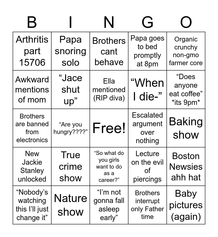 This bingo card has a free space and 29 words: “Nobody’s watching this I’ll just change it”, Clock ticking, “Are you hungry????”, Longing sigh at the sight of a singular electronic device, Arthritis part 15706, Brothers cant behave, “Jace shut up”, True crime show, Escalated argument over nothing, Nature show, Baking show, Baby pictures (again), “I’m not gonna fall asleep early”, Brothers interrupt only Father time, “Does anyone eat coffee” *its 9pm*, Dad falls asleep 5 minutes upon bonding time, “So what do you girls want to do as a career?”, New Jackie Stanley unlocked, Organic crunchy non-gmo farmer core, Brothers are banned from electronics, Lecture on the evil of piercings, Livin da hussie life stories from g-ma, “When I die-”, Awkward mentions of mom, Papa goes to bed promptly at 8pm, Papa snoring solo, Boston Newsies ahh hat, Ella mentioned (RIP diva) and Dad wakes up at 1pm.