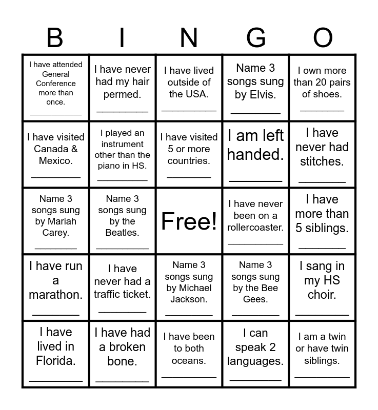 This bingo card has a free space and 29 words: I have lived in Florida. ________, I have visited all 50 states. _________, Name 3 songs sung by the Beatles. __________, I remember where I was when man walked on the moon. ___________, I have attended General Conference more than once. ____________, I have lived outside of the USA. __________, I played an instrument other than the piano in HS. __________, I have never had a traffic ticket. ________, I have never been on a rollercoaster. __________, I have had a broken bone. ________, I have more than 5 siblings. _______, I am a twin or have twin siblings. __________, I have been to both oceans. __________, I can speak 2 languages. ________, I have never had stitches. _______, I have never had pineapple on pizza. _________, Name 3 songs sung by Michael Jackson. _________, I have run a marathon. _______, I own more than 20 pairs of shoes. ________, Name 3 songs sung by Mariah Carey. ________, Name 3 songs sung by the Bee Gees. _________, I can do a cartwheel. ________, I am left handed. ______, I have visited Canada & Mexico. _________, Name 3 songs sung by Elvis. ________, I have never had my hair permed. _________, I sang in my HS choir. ________, I have visited 5 or more countries. ________ and I am an only child. ________.