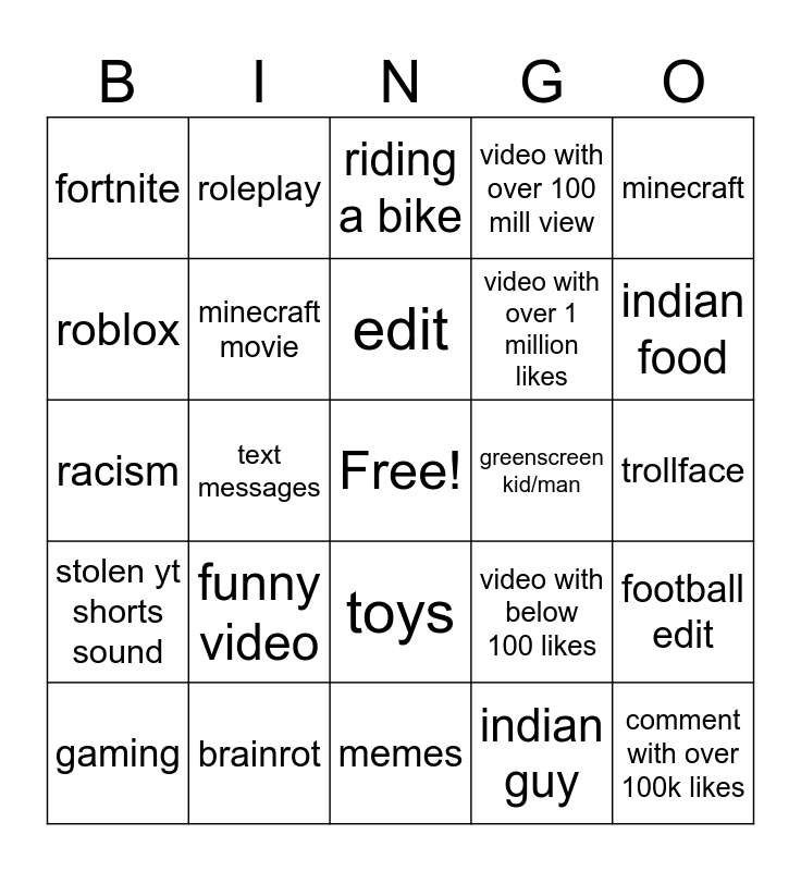 This bingo card has a free space and 24 words: funny video, brainrot, edit, gaming, minecraft, fortnite, roblox, roleplay, greenscreen kid/man, toys, video with over 1 million likes, racism, video with below 100 likes, football edit, minecraft movie, indian guy, trollface, riding a bike, indian food, text messages, comment with over 100k likes, stolen yt shorts sound, video with over 100 mill view and memes.