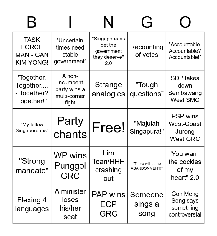 This bingo card has a free space and 24 words: WP wins Punggol GRC, A minister loses his/her seat, Strange analogies, Flexing 4 languages, "Accountable. Accountable? Accountable!", TASK FORCE MAN - GAN KIM YONG!, 'Together. Together.... - Together? Together!", 'Uncertain times need stable government", "Majulah Singapura!", Lim Tean/HHH crashing out, "Tough questions", "My fellow Singaporeans", "There will be no ABANDONMENT!", "You warm the cockles of my heart" 2.0, A non-incumbent party wins a multi-corner fight, Someone sings a song, PSP wins West-Coast Jurong West GRC, "Singaporeans get the government they deserve" 2.0, SDP takes down Sembawang West SMC, Party chants, Goh Meng Seng says something controversial, "Strong mandate", Recounting of votes and PAP wins ECP GRC.