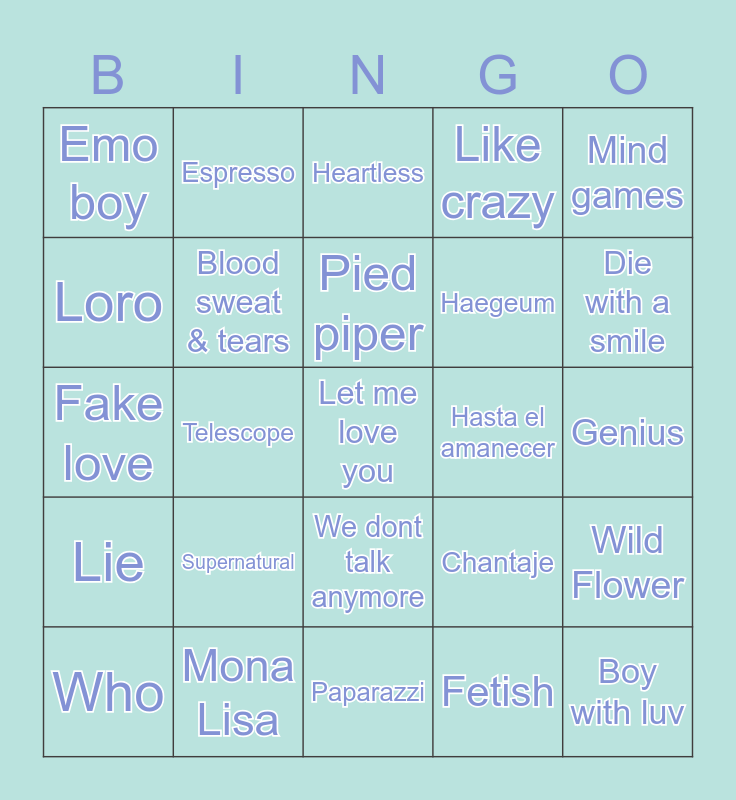 This bingo card has 25 words: Supernatural, Paparazzi, Pied piper, Who, Mind games, Emo boy, Loro, Espresso, Hasta el amanecer, We dont talk anymore, Haegeum, Fake love, Chantaje, Wild Flower, Blood sweat & tears, Boy with luv, Genius, Heartless, Die with a smile, Telescope, Let me love you, Mona Lisa, Lie, Like crazy and Fetish.