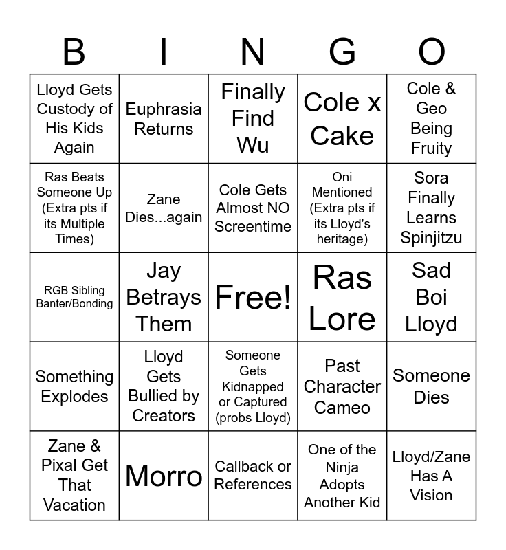 This bingo card has a free space and 24 words: Lloyd Gets Bullied by Creators, Morro, Cole Gets Almost NO Screentime, Zane & Pixal Get That Vacation, Cole & Geo Being Fruity, Lloyd Gets Custody of His Kids Again, Ras Beats Someone Up (Extra pts if its Multiple Times), Euphrasia Returns, Ras Lore, Someone Gets Kidnapped or Captured (probs Lloyd), Oni Mentioned (Extra pts if its Lloyd's heritage), RGB Sibling Banter/Bonding, Past Character Cameo, Someone Dies, Zane Dies...again, One of the Ninja Adopts Another Kid, Sad Boi Lloyd, Finally Find Wu, Sora Finally Learns Spinjitzu, Jay Betrays Them, Lloyd/Zane Has A Vision, Something Explodes, Cole x Cake and Callback or References.