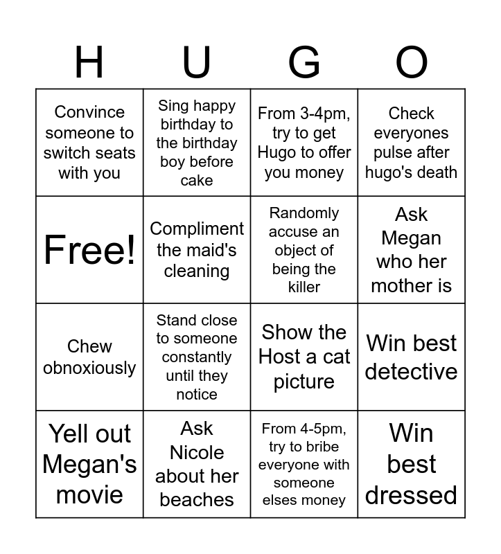 This bingo card has 16 words: Ask Nicole about her beaches, Win best detective, From 3-4pm, try to get Hugo to offer you money, Convince someone to switch seats with you, Chew obnoxiously, Sing happy birthday to the birthday boy before cake, Show the Host a cat picture, From 4-5pm, try to bribe everyone with someone elses money, Free!, Compliment the maid's cleaning, Yell out Megan's movie, Check everyones pulse after hugo's death, Stand close to someone constantly until they notice, Ask Megan who her mother is, Randomly accuse an object of being the killer and Win best dressed.