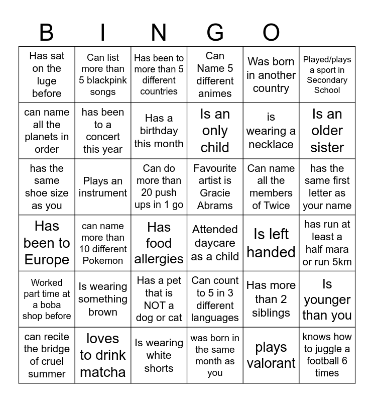 This bingo card has 36 words: Can count to 5 in 3 different languages, Has a pet that is NOT a dog or cat, was born in the same month as you, can name all the planets in order, Has been to Europe, Favourite artist is Gracie Abrams, has been to a concert this year, Is wearing white shorts, Was born in another country, Has more than 2 siblings, Is an older sister, Can Name 5 different animes, Is younger than you, Plays an instrument, Is an only child, Has sat on the luge before, Worked part time at a boba shop before, Can name all the members of Twice, has the same shoe size as you, Has been to more than 5 different countries, Can do more than 20 push ups in 1 go, can name more than 10 different Pokemon, Attended daycare as a child, Has food allergies, Is left handed, Can list more than 5 blackpink songs, is wearing a necklace, loves to drink matcha, Has a birthday this month, Played/plays a sport in Secondary School, knows how to juggle a football 6 times, can recite the bridge of cruel summer, has run at least a half mara or run 5km, has the same first letter as your name, Is wearing something brown and plays valorant.