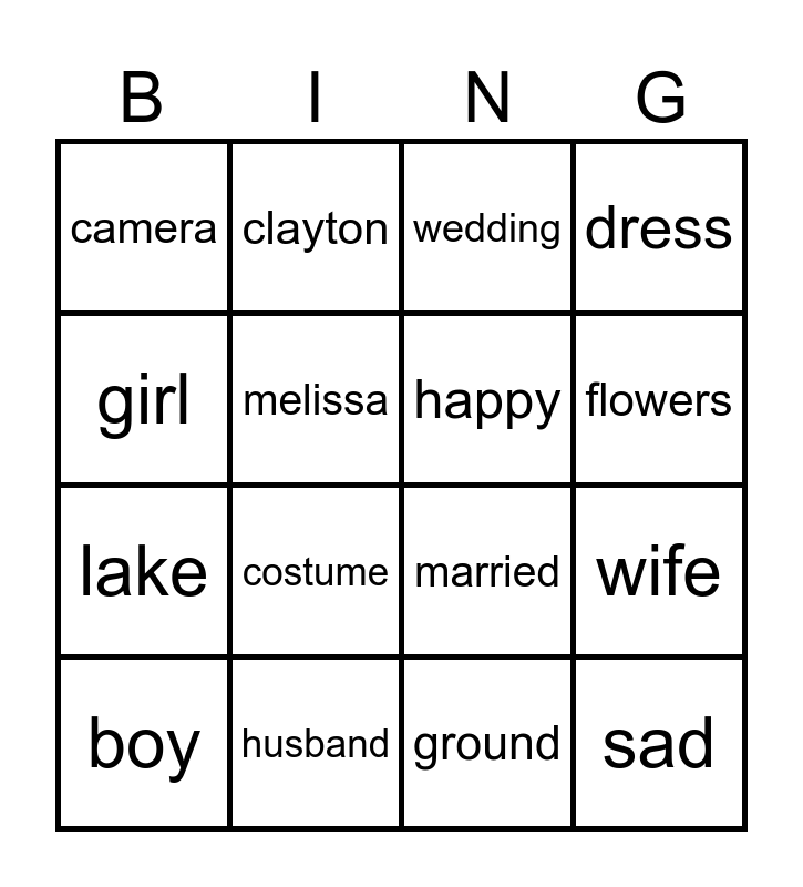 This bingo card has 16 words: husband, wife, wedding, camera, lake, clayton, married, ground, girl, melissa, boy, dress, costume, flowers, happy and sad.