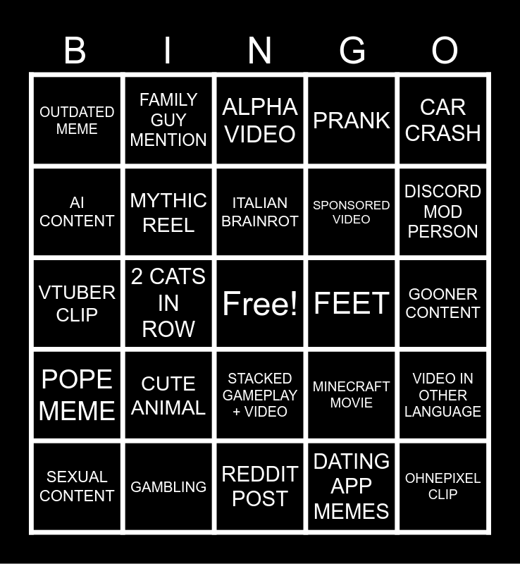 This bingo card has a free space and 24 words: CUTE ANIMAL, GAMBLING, ITALIAN BRAINROT, SEXUAL CONTENT, CAR CRASH, OUTDATED MEME, AI CONTENT, FAMILY GUY MENTION, FEET, STACKED GAMEPLAY + VIDEO, SPONSORED VIDEO, VTUBER CLIP, MINECRAFT MOVIE, VIDEO IN OTHER LANGUAGE, MYTHIC REEL, DATING APP MEMES, GOONER CONTENT, ALPHA VIDEO, DISCORD MOD PERSON, 2 CATS IN ROW, OHNEPIXEL CLIP, POPE MEME, PRANK and REDDIT POST.