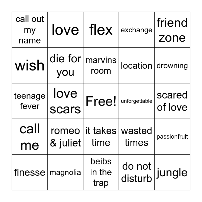 This bingo card has a free space and 28 words: passionfruit, star shopping, location, do not disturb, wish, flex, love, call me, unforgettable, finesse, teenage fever, exchange, magnolia, beibs in the trap, drowning, all girls are the same, romeo & juliet, die for you, marvins room, it takes time, call out my name, lucid dreams, jungle, love scars, scared of love, wasted times, friend zone and let me explain.