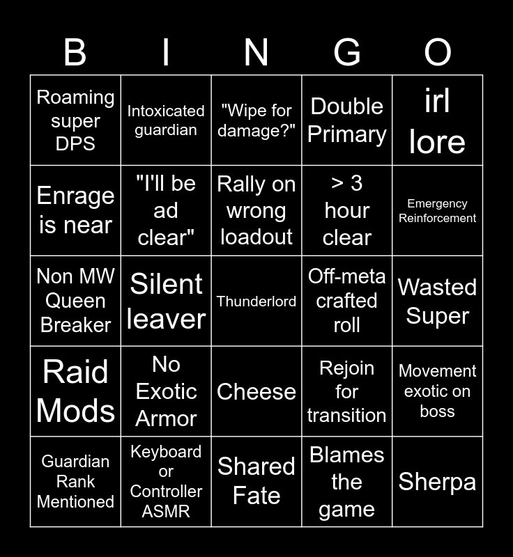 This bingo card has a free space and 47 words: Unfunny Name, Sherpa, Xbox 360 mic, Shared Fate, No Exotic Armor, > 1 hour for 1 encounter, Intoxicated guardian, Raid Exotic Drop, Enrage is near, Bugged VC, "I'll be ad clear", Double Primary, Movement exotic on boss, Rejoin for transition, Failed Skate, 10+ gilded title, Rally on wrong loadout, Off-meta crafted roll, Bad callout, irl lore, Silent leaver, Blames the game, Roaming super DPS, > 3 hour clear, Audible Bodily Functions, Emergency Reinforcement, Guardian Rank Mentioned, PVP Roll, Cheese, Raid Mods, Fireteam Disbands, Eating on mic, Glaive, Destiny nostalgia, Complains about class jump, Keyboard or Controller ASMR, Wasted Super, Misinfo, Mis-pronounce Onpam, Wasted Exotic, Knower, "Wipe for damage?", Non MW Queen Breaker, Marksman Scope Selected, Marathon Mentioned, Animal Sounds and "QueenS breaker".