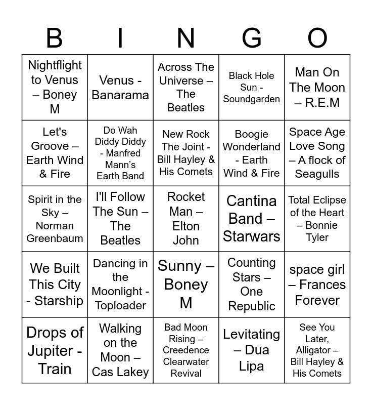 This bingo card has 44 words: Space Oddity – David Bowie, Rocket Man – Elton John, Starman – David Bowie, Drops of Jupiter -Train, Fly Me To The Moon – Frank Sinatra, Levitating – Dua Lipa, Across The Universe – The Beatles, Champagne Supernova - Oasis, Man On The Moon – R.E.M, Walking on the Moon – Cas Lakey, Black Hole Sun - Soundgarden, Cantina Band – Starwars, Sunny – Boney M, Dancing in the Moonlight - Toploader, Talking to the Moon – Bruno Mars, Bad Moon Rising – Creedence Clearwater Revival, Mr. Blue Sky – Electric Light Orchestra, Spirit in the Sky – Norman Greenbaum, Night Fever – Bee Gees, Space Age Love Song – A flock of Seagulls, Venus - Banarama, Under The Milky Way – The Chruch, Lucy In The Sky With Diamonds – The Beatles, Nightflight to Venus – Boney M, Star Wars Theme – Star Wars, Total Eclipse of the Heart – Bonnie Tyler, Skyfall - Adele, A Sky Full of Stars - Coldplay, Counting Stars – One Republic, We Built This City - Starship, All Star – Smash Mouth, space girl – Frances Forever, The Final Countdown - Europe, Blue Moon – Ella Fitzgerald, I'll Follow The Sun – The Beatles, Planet Claire – The B-52’s, Fireflies – Owl City, See You Later, Alligator – Bill Hayley & His Comets, New Rock The Joint - Bill Hayley & His Comets, Let's Groove – Earth Wind & Fire, Boogie Wonderland - Earth Wind & Fire, Blinded by the Light - Manfred Mann’s Earth Band, Do Wah Diddy Diddy - Manfred Mann’s Earth Band and Walking On A Dream – Empire of the Sun.