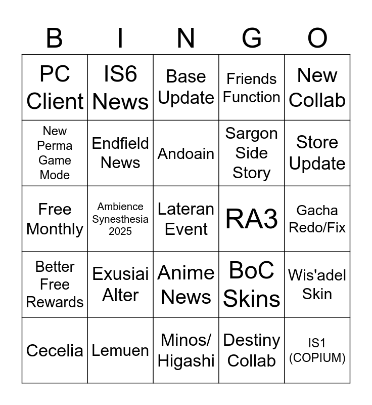 This bingo card has a free space and 24 words: Exusiai Alter, Lemuen, Andoain, Cecelia, New Collab, PC Client, New Perma Game Mode, IS6 News, RA3, Anime News, Sargon Side Story, Free Monthly, BoC Skins, Wis'adel Skin, Endfield News, Destiny Collab, Gacha Redo/Fix, Base Update, Store Update, Ambience Synesthesia 2025, IS1 (COPIUM), Better Free Rewards, Friends Function and Minos/ Higashi.