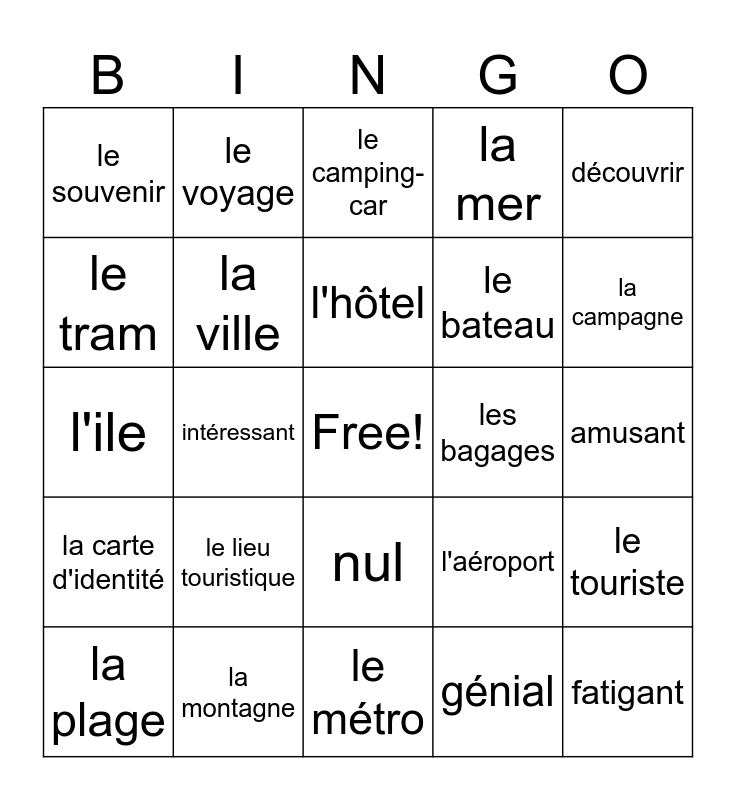This bingo card has a free space and 27 words: l'aéroport, l'avion, le bateau, le métro, le tram, le camping-car, le voyage, la carte d'identité, les bagages, le touriste, l'ile, la mer, la plage, la montagne, la campagne, le camping, la ville, l'hôtel, le lieu touristique, le souvenir, amusant, génial, intéressant, fatigant, nul, découvrir and visiter.