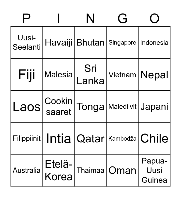 This bingo card has 25 words: Intia, Thaimaa, Sri Lanka, Australia, Indonesia, Uusi-Seelanti, Fiji, Havaiji, Malediivit, Qatar, Vietnam, Laos, Kambodža, Chile, Malesia, Papua-Uusi Guinea, Japani, Bhutan, Nepal, Cookin saaret, Tonga, Etelä-Korea, Filippiinit, Singapore and Oman.