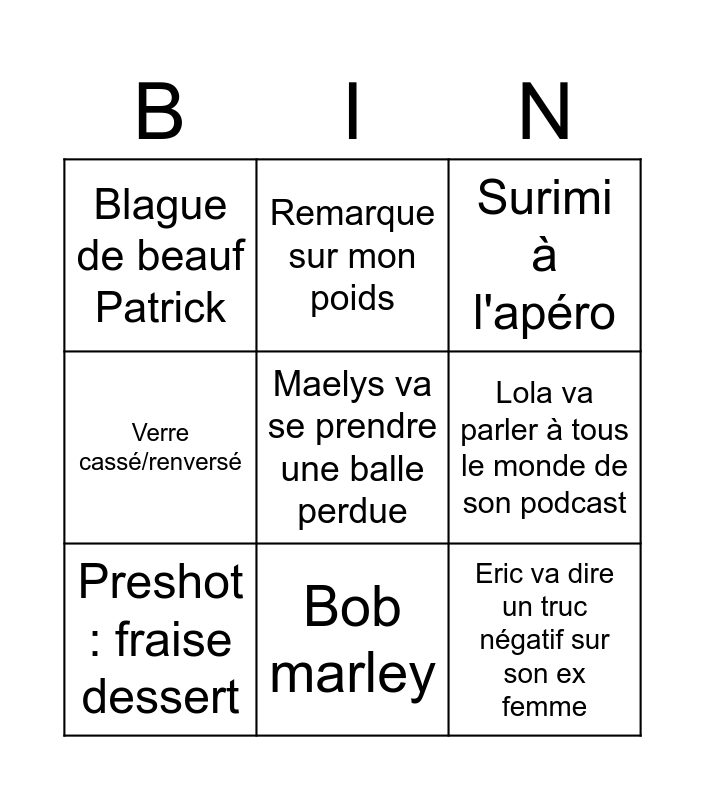 This bingo card has a free space and 8 words: Lola va parler à tous le monde de son podcast, Surimi à l'apéro, Remarque sur mon poids, Preshot : fraise dessert, Blague de beauf Patrick, Eric va dire un truc négatif sur son ex femme, Verre cassé/renversé and Bob marley.