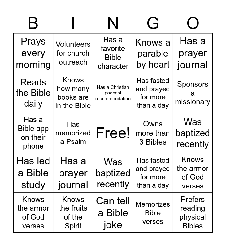 This bingo card has a free space and 100 words: Can name 5 Bible miracles, Knows the story of Joseph's dreams, Was baptized recently, Knows the fruits of the Spirit, Can explain the meaning of Sabbath, Can explain the story of the Prodigal Son, Has given a testimony, Went on a Pathfinder camporee, Has taught a Sabbath School class, Reads the Bible daily, Is part of the choir, Knows the Beatitudes, Knows who Esther is, Knows the fruits of the Spirit, Can name 5 women in the Bible, Has a favorite Bible verse, Has fasted and prayed for more than a day, Knows the story of David and Goliath, Knows the Beatitudes, Sponsors a missionary, Can describe Paul's missionary journeys, Knows a parable by heart, Participated in a mission trip, Has visited another church abroad, Has met a missionary, Owns more than 3 Bibles, Has a prayer journal, Has fasted and prayed for more than a day, Can find Genesis 1:1 in under 10 seconds, Volunteers for church outreach, Has memorized a Psalm, Prays every morning, Went on a Pathfinder camporee, Has a favorite Bible verse, Memorizes Bible verses, Has a Christian podcast recommendation, Knows the armor of God verses, Attended a camp meeting, Has read the Bible in a year, Has given a testimony, Has taught a Sabbath School class, Has a Bible app on their phone, Has a Bible app on their phone, Was once in an evangelistic campaign, Sponsors a missionary, Has a favorite Bible character, Knows a verse about love, Knows a verse about love, Has read the whole book of Psalms, Can tell a Bible joke, Attends midweek prayer meeting, Can explain the story of the Prodigal Son, Has a study Bible, Can recite John 3:16, Is a church officer, Can find Genesis 1:1 in under 10 seconds, Has led a Bible study, Can recite John 3:16, Memorizes Bible verses, Knows a parable by heart, Owns more than 3 Bibles, Knows all 10 Commandments, Can name 5 women in the Bible, Is a church officer, Can describe Paul's missionary journeys, Attended a camp meeting, Knows the story of Joseph's dreams, Can name all 12 disciples, Attends midweek prayer meeting, Prays every morning, Has visited another church abroad, Has a prayer journal, Can name all 12 disciples, Can name 5 Bible miracles, Was once in an evangelistic campaign, Has met a missionary, Knows who Esther is, Reads the Bible daily, Plays an instrument for church, Is part of the choir, Knows the story of David and Goliath, Prefers reading physical Bibles, Can tell a Bible joke, Was baptized recently, Knows all 10 Commandments, Volunteers for church outreach, Has a study Bible, Knows how many books are in the Bible, Has read the Bible in a year, Has led a Bible study, Can explain the meaning of Sabbath, Has memorized a Psalm, Prefers reading physical Bibles, Knows the armor of God verses, Knows how many books are in the Bible, Has a favorite Bible character, Has a Christian podcast recommendation, Plays an instrument for church, Has read the whole book of Psalms and Participated in a mission trip.