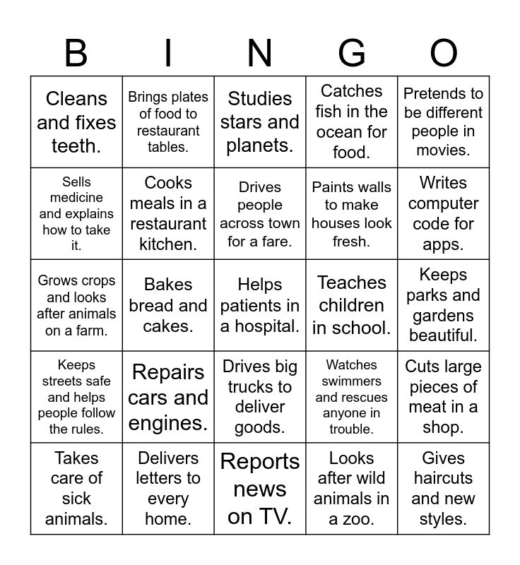 This bingo card has a free space and 29 words: Takes care of sick animals., Flies people across the sky., Bakes bread and cakes., Puts out dangerous fires., Cleans and fixes teeth., Studies stars and planets., Cooks meals in a restaurant kitchen., Repairs cars and engines., Teaches children in school., Delivers letters to every home., Keeps parks and gardens beautiful., Gives haircuts and new styles., Reports news on TV., Looks after wild animals in a zoo., Writes computer code for apps., Performs songs and plays guitar on stage., Drives big trucks to deliver goods., Keeps streets safe and helps people follow the rules., Pretends to be different people in movies., Grows crops and looks after animals on a farm., Watches swimmers and rescues anyone in trouble., Stops water leaks under the sink., Paints walls to make houses look fresh., Sells medicine and explains how to take it., Catches fish in the ocean for food., Brings plates of food to restaurant tables., Cuts large pieces of meat in a shop., Drives people across town for a fare. and Helps passengers, serves snacks on a plane..