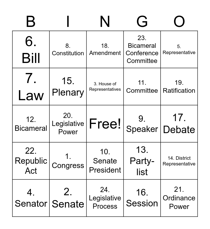 This bingo card has a free space and 24 words: 1. Congress, 2. Senate, 3. House of Representatives, 4. Senator, 5. Representative, 6. Bill, 7. Law, 8. Constitution, 9. Speaker, 10. Senate President, 11. Committee, 12. Bicameral, 13. Party-list, 14. District Representative, 15. Plenary, 16. Session, 17. Debate, 18. Amendment, 19. Ratification, 20. Legislative Power, 21. Ordinance Power, 22. Republic Act, 23. Bicameral Conference Committee and 24. Legislative Process.