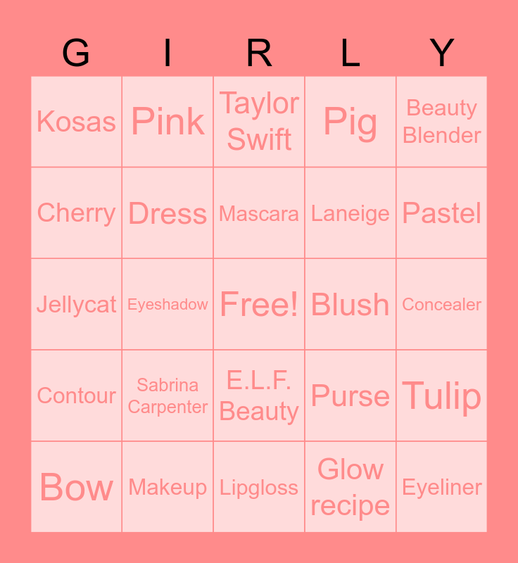 This bingo card has a free space and 27 words: Bow, Makeup, Lipgloss, Glow recipe, Beauty Blender, Cherry, Pink, E.L.F. Beauty, Blush, Tulip, Contour, Dress, Purse, Eyeliner, Jellycat, Rose, Mascara, Pig, Concealer, Kosas, Eyeshadow, Skirt, Laneige, Pastel, Sabrina Carpenter, Taylor Swift and Face Masks.