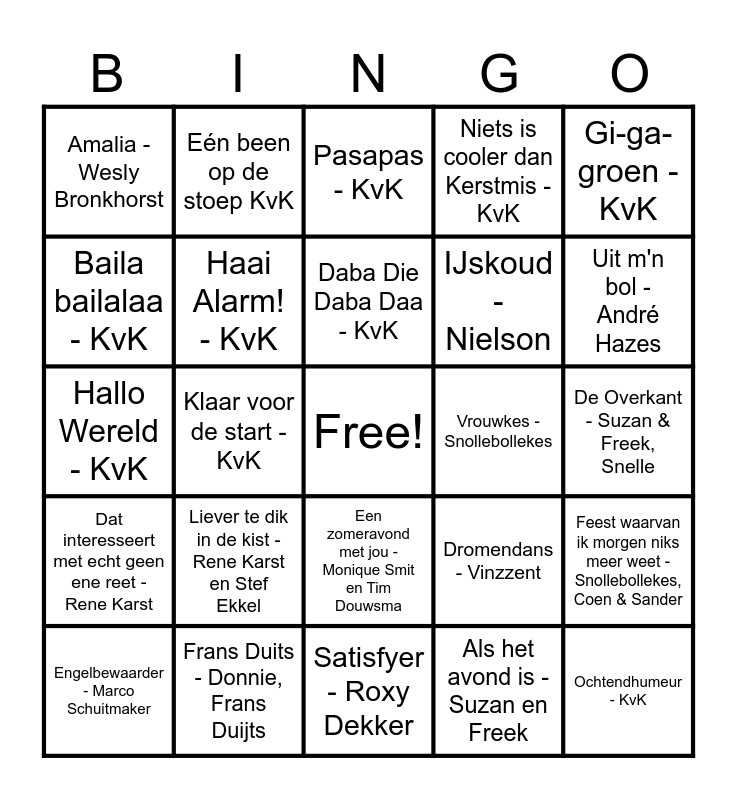 This bingo card has a free space and 75 words: Okido - KvK, Koningsspelen medley - KvK, Pasapas - KvK, Bewegen is gezond - KvK, Klaar voor de start - KvK, Energie! - KvK, Fitlala - KvK, Hand in hand - KvK, Doe de Kanga - KvK, Zij aan zij - KvK, FitTop10 - KvK, ZiggZagg - KvK, Daba Die Daba Daa - KvK, Baila bailalaa - KvK, Hallo Wereld - KvK, Klaar voor de start - KvK, Bewegen is gezond - KvK, Ochtendhumeur - KvK, Worden wat je wil - KvK, Gi-ga-groen - KvK, Op een onbewoond eiland - KvK, Hallo Wereld - KvK, Haai Alarm! - KvK, Eén been op de stoep KvK, Niets is cooler dan Kerstmis - KvK, Raar maar waar - KvK, Hupsakee! - KvK, Ha, ha, ha, je vader - KvK, Het regent zonnestralen - Acda en de Munnik, Het is al laat toch - Racoon, Oceaan - Racoon, Laat de zon in je hart - Rene Schuurmans, Rosanne - Nick en Simon, Dromendans - Vinzzent, Uit m'n bol - André Hazes, IJskoud - Nielson, Sexy als ik dans - Nielson, Even aan mijn moeder vragen - Bloem, De Overkant - Suzan & Freek, Snelle, Als het avond is - Suzan en Freek, Het is een nacht - Guus Meeuwis, Dromen zijn bedrog - Marco Borsato, Heb je even voor mij - Frans Bauer, Blijven Slapen - Snelle en Maan, Automatisch - FLEMMING, Amsterdam - FLEMMING, Engelbewaarder - Marco Schuitmaker, Amalia - Wesly Bronkhorst, Brabant - Guus Meeuwis, Terug in de tijd - Yves Berendse, Hier mag alles - Donnie, Marco Schuitmaker, Een zomeravond met jou - Monique Smit en Tim Douwsma, Hippie Shake - K3, Oya Lélé - K3, Het Vliegerlied - Cafe the Block, Toeter op m'n waterscooter - Gebroeders Ko, Atje voor de sfeer - Rene Karst, Viva Hollandia- Wolter Kroes, Oma's aan de top - K3, Springen Nondeju - Snollebollekes, Liever te dik in de kist - Rene Karst en Stef Ekkel, Snollebolleke - Snollebollekes, Shirt uit en zwaaien - Feestteam, DJ Maurice, Je hoeft niet naar huis vannacht - Marco Borsato, Ferry de Roze Flamingo - Barry Fest en Tim Schalkx, Vrouwkes - Snollebollekes, Het is altijd lente in de ogen van...- Peter de Koning, Helikopter - Gebroeders Ko, Dochter van de groenteboer - Gebroeders Ko, Gerard Joling, Feest waarvan ik morgen niks meer weet - Snollebollekes, Coen & Sander, Dat interesseert met echt geen ene reet - Rene Karst, Frans Duits - Donnie, Frans Duijts, Ga dan! - Roxy Dekker, Satisfyer - Roxy Dekker and Sugardaddy - Roxy Dekker.
