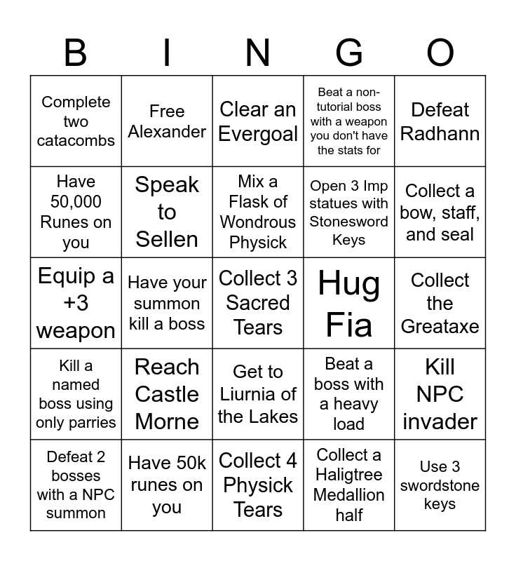 This bingo card has a free space and 44 words: Defeat a non-tutorial boss with only jump attacks, Use 3 swordstone keys, Talk to Blaidd, Defeat 2 bosses with a NPC summon, Mix your Physick flask with 2 tears, Collect a Haligtree Medallion half, Clear an Evergoal, Collect 3 spells, Defeat Radhann, Have 50k runes on you, Beat a non-tutorial boss with a weapon you don't have the stats for, Hug Fia, Get to Liurnia of the Lakes, Reach Castle Morne, Reach Level 20, Collect 4 Physick Tears, Collect 3 Incantations, Equip a +3 weapon, Visit 3 regions, Collect a bow, staff, and seal, Free Alexander, Defeat a Duo Boss, Duplicate a Boss Remembrance, Complete two catacombs, Have 25 Faith, Collect the Greataxe, Have 3 Spells, Touch 15 sites of Grace, Beat a boss with a heavy load, Kill a named boss using only parries, Craft two types of grease, Kill NPC invader, Defeat an Erdtree Avatar, Get teleported by trapping chest, Have your summon kill a boss, Collect 15 mushrooms, Equip an Altered piece of armor, Defeat two Evergaols, Mix a Flask of Wondrous Physick, Have 50,000 Runes on you, Open 3 Imp statues with Stonesword Keys, Complete the combat tutorial, Speak to Sellen and Kill Varré.