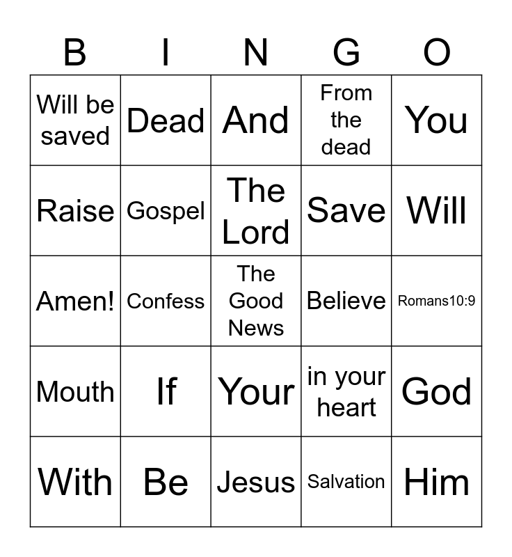 This bingo card has a free space and 24 words: If, Be, The Lord, With, You, Will be saved, Raise, Dead, Believe, Your, Save, Amen!, in your heart, God, Gospel, Salvation, Romans10:9, And, Will, Confess, Him, Mouth, From the dead and Jesus.