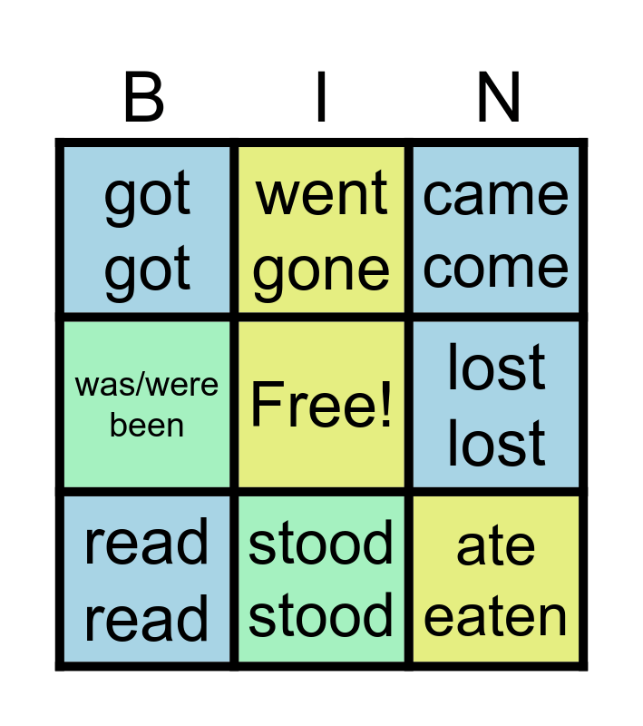 This bingo card has a free space and 20 words: broke broken, could could, came come, did done, drank drunk, ate eaten, fell fallen, got got, gave given, went gone, had had, heard heard, lost lost, made made, read read, sat sat, stood stood, was/were been, won won and wrote written.