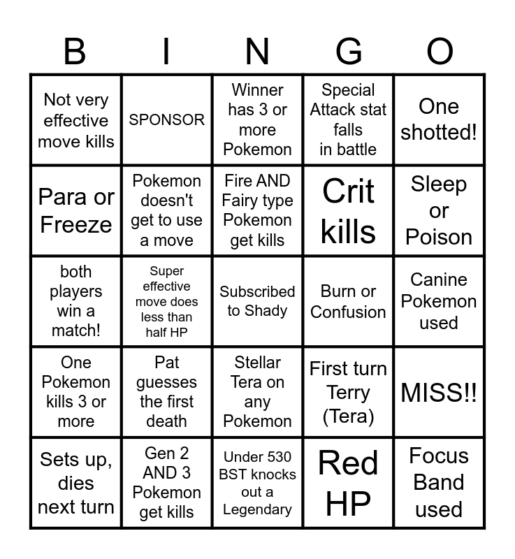 This bingo card has a free space and 24 words: Pat guesses the first death, Gen 2 AND 3 Pokemon get kills, Fire AND Fairy type Pokemon get kills, Sets up, dies next turn, One shotted!, Not very effective move kills, Para or Freeze, SPONSOR, Burn or Confusion, Stellar Tera on any Pokemon, Crit kills, both players win a match!, First turn Terry (Tera), MISS!!, Pokemon doesn't get to use a move, Red HP, Canine Pokemon used, Winner has 3 or more Pokemon, Sleep or Poison, Super effective move does less than half HP, Focus Band used, One Pokemon kills 3 or more, Special Attack stat falls in battle and Under 530 BST knocks out a Legendary.