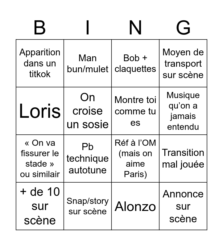 This bingo card has 16 words: + de 10 sur scène, Snap/story sur scène, Bob + claquettes, Moyen de transport sur scène, Loris, Man bun/mulet, Réf à l’OM (mais on aime Paris), Transition mal jouée, Apparition dans un titkok, On croise un sosie, Alonzo, Musique qu’on a jamais entendu, « On va fissurer le stade » ou similair, Pb technique autotune, Montre toi comme tu es and Annonce sur scène.
