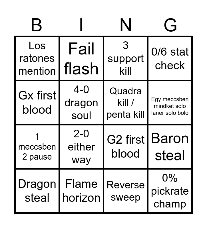 This bingo card has 16 words: Flame horizon, Baron steal, 3 support kill, Los ratones mention, 1 meccsben 2 pause, Fail flash, G2 first blood, Reverse sweep, Gx first blood, 4-0 dragon soul, Dragon steal, 0/6 stat check, 2-0 either way, Egy meccsben mindket solo laner solo bolo, Quadra kill / penta kill and 0% pickrate champ.