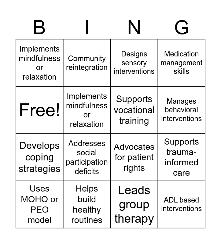 This bingo card has 16 words: Helps build healthy routines, Supports trauma- informed care, Designs sensory interventions, Implements mindfulness or relaxation, Develops coping strategies, Community reintegration, Advocates for patient rights, Leads group therapy, Free!, Implements mindfulness or relaxation, Uses MOHO or PEO model, Medication management skills, Addresses social participation deficits, Manages behavioral interventions, Supports vocational training and ADL based interventions.