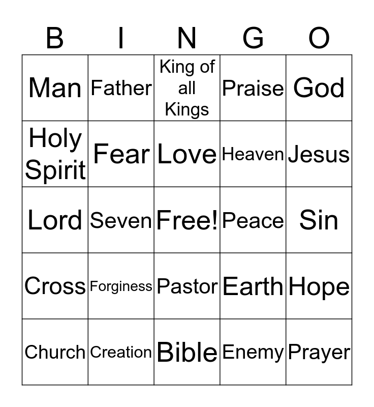 This bingo card has a free space and 24 words: Forginess, Creation, Love, Church, God, Man, Holy Spirit, Father, Peace, Pastor, Heaven, Lord, Earth, Hope, Fear, Enemy, Sin, King of all Kings, Jesus, Seven, Prayer, Cross, Praise and Bible.