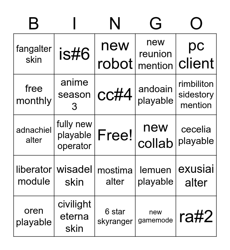 This bingo card has a free space and 24 words: wisadel skin, civilight eterna skin, cc#4, oren playable, pc client, fangalter skin, free monthly, is#6, new collab, mostima alter, andoain playable, adnachiel alter, lemuen playable, exusiai alter, anime season 3, new gamemode, cecelia playable, new robot, rimbiliton sidestory mention, fully new playable operator, ra#2, liberator module, new reunion mention and 6 star skyranger.